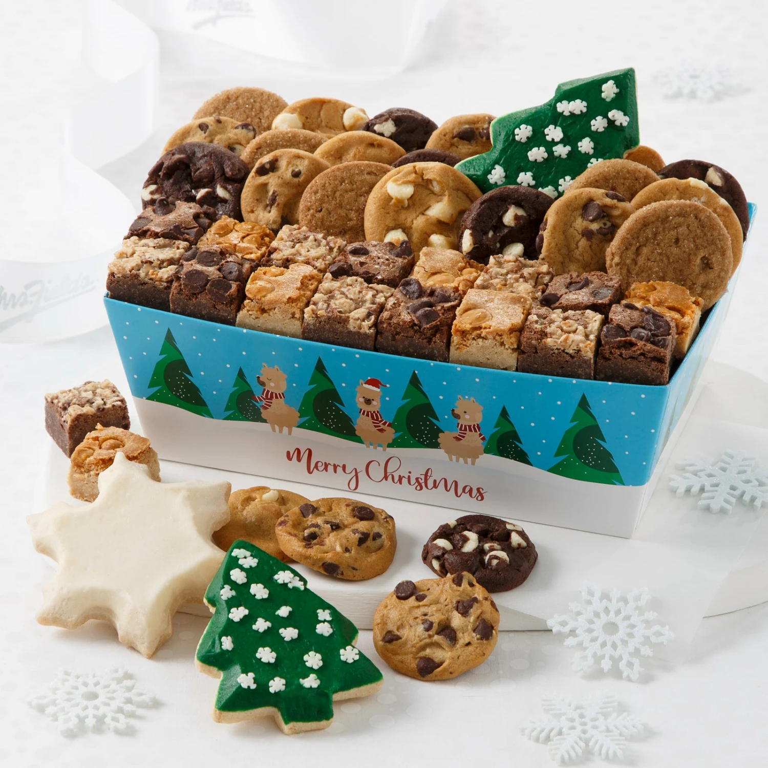 A trio of llamas in a snowy forest add whimsical delight to this treat-filled gift container. Comes with 24 Nibblers® bite-sized cookies, 18 brownie bites, 2 frosted tree cookies and 1 frosted snowflake cookie.
