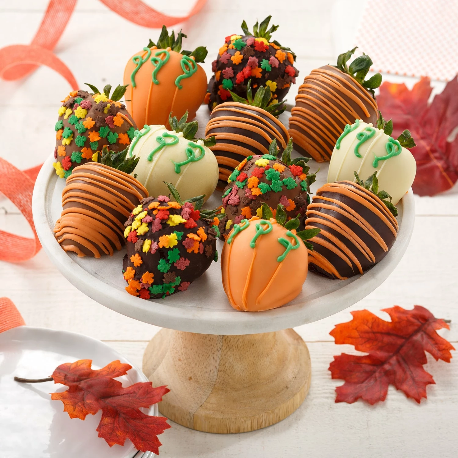 The Fabulous Fall Strawberries: 12 large, luscious berries, dipped in three kinds of Belgian chocolate (dark, milk, and white) are exquisitely hand-decorated with pumpkins, leaf sprinkles & drizzle. Carefully packaged in protective insulation and shipped with ice, these decadent indulgences arrive in perfect condition, ready to surprise and delight. Crafted by artisans in a small batch kitchen, no two will looks exactly the same. All chocolate strawberries will ship 1-day for optimal freshness.
