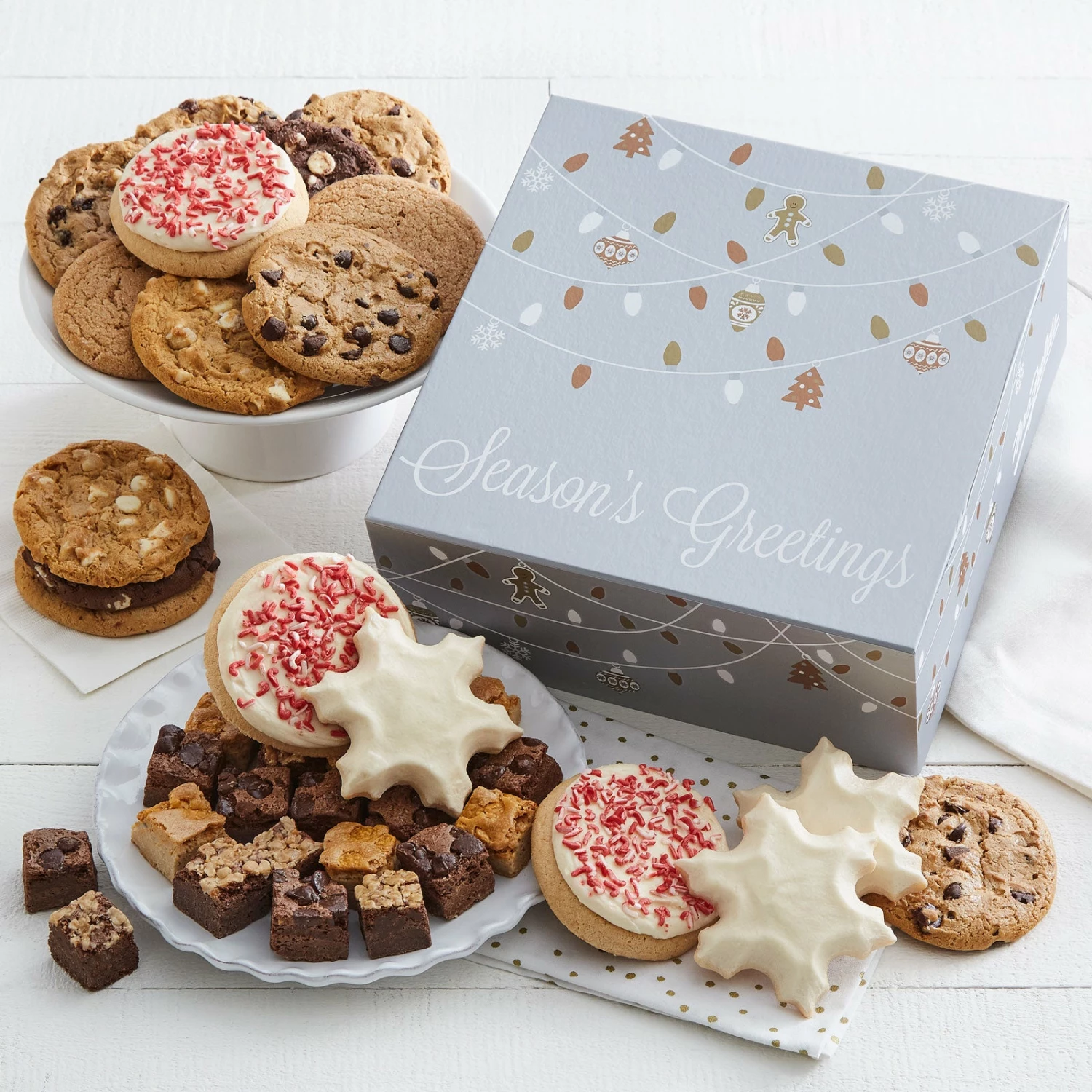 The season’s best greetings are deliciously edible. Includes 12 original cookies, 24 brownie bites, 3 frosted peppermint cookies, and 3 frosted snowflake cookies.