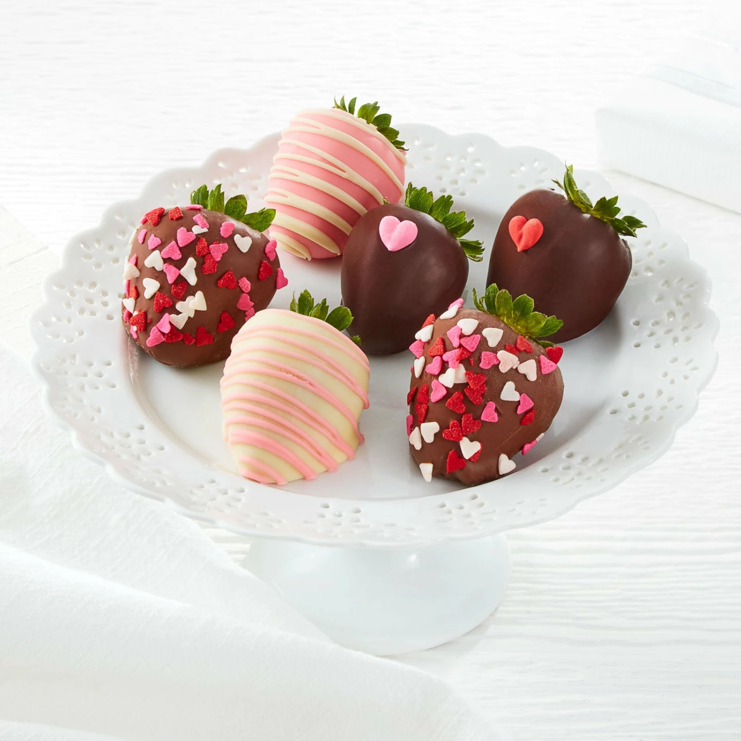 The Scrumptious Six: Large, luscious berries, dipped in three kinds of Belgian chocolate (dark, milk, and white) are exquisitely hand-decorated with heart sprinkles or drizzled icing for your confectionery pleasure. Carefully packaged in protective insulation and shipped with ice, these decadent indulgences arrive in perfect condition, ready to surprise and delight. Crafted by artisans in a small batch kitchen, no two will looks exactly the same.Â