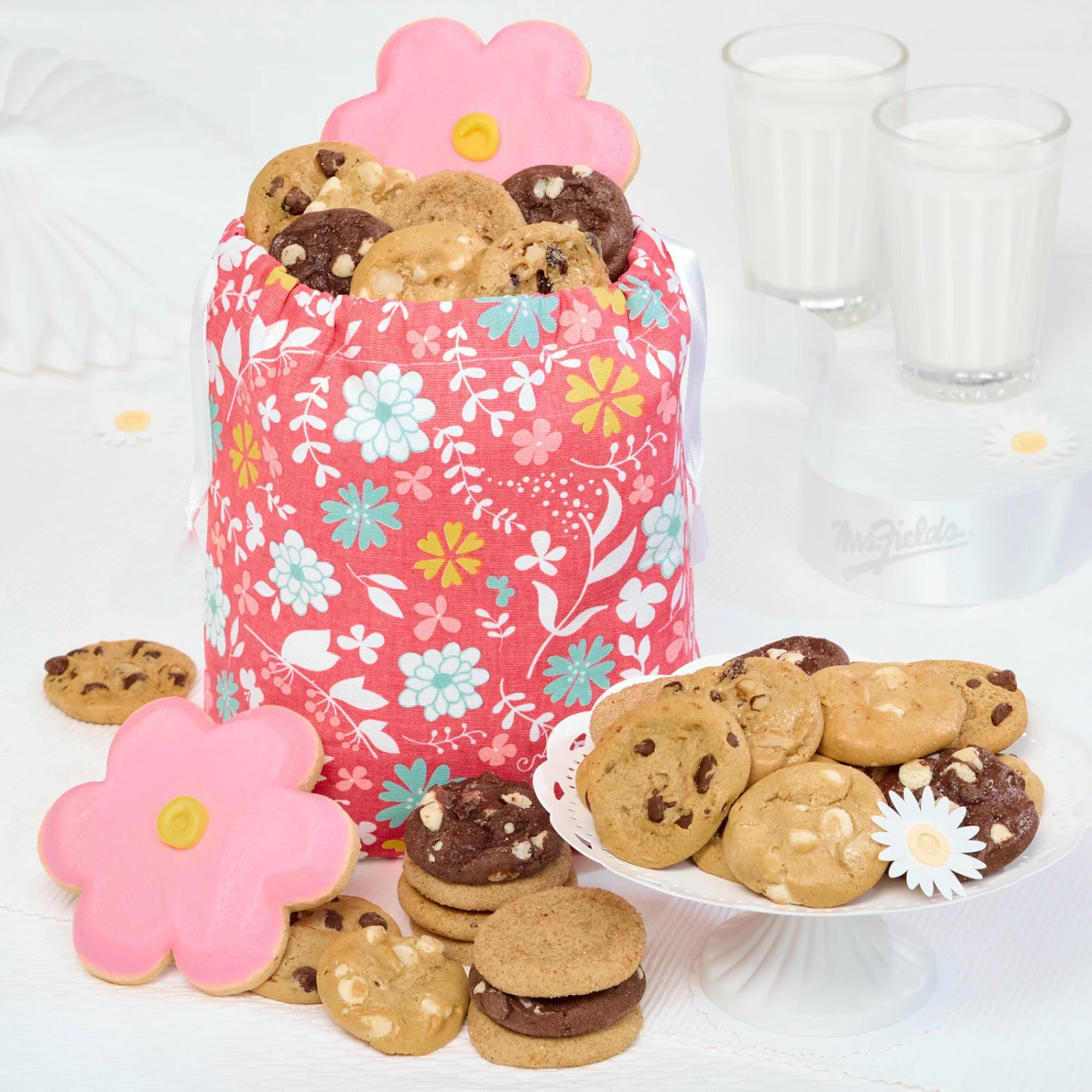 The promise of sweet things to come arrives in a decorative, reusable tote. We fill this tote with 30 Nibblers® Bite-Sized Cookies and 2 frosted flower cookies.