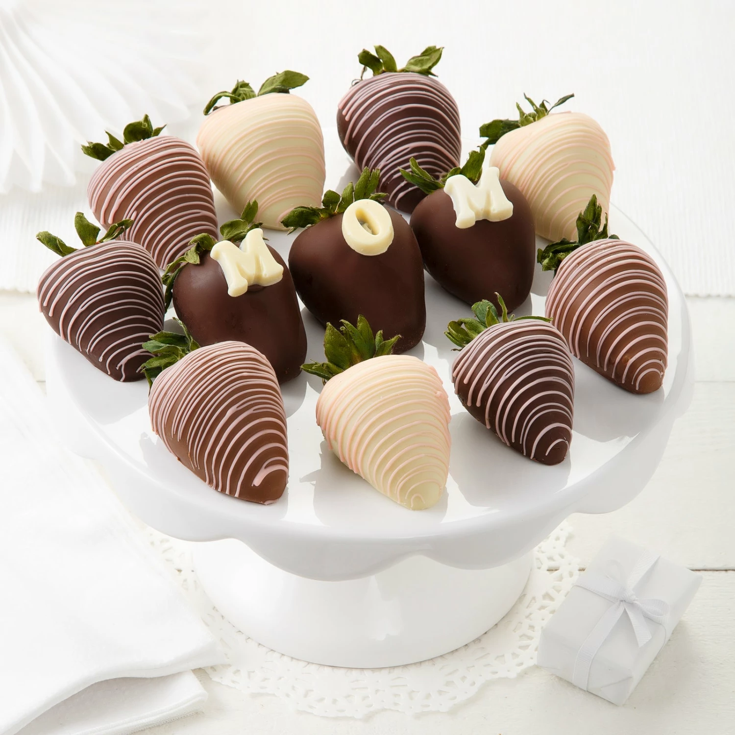 A gift M-O-M will love! 12 large, luscious berries, dipped in three kinds of Belgian chocolate (dark, milk and white) are exquisitely hand-decorated in three different designs plus a Mother’s Day message in edible letters. There culinary delights are carefully packaged in protective insulation and shipped with ice. Crafted by artisans in a small batch kitchen, no two will looks exactly the same.