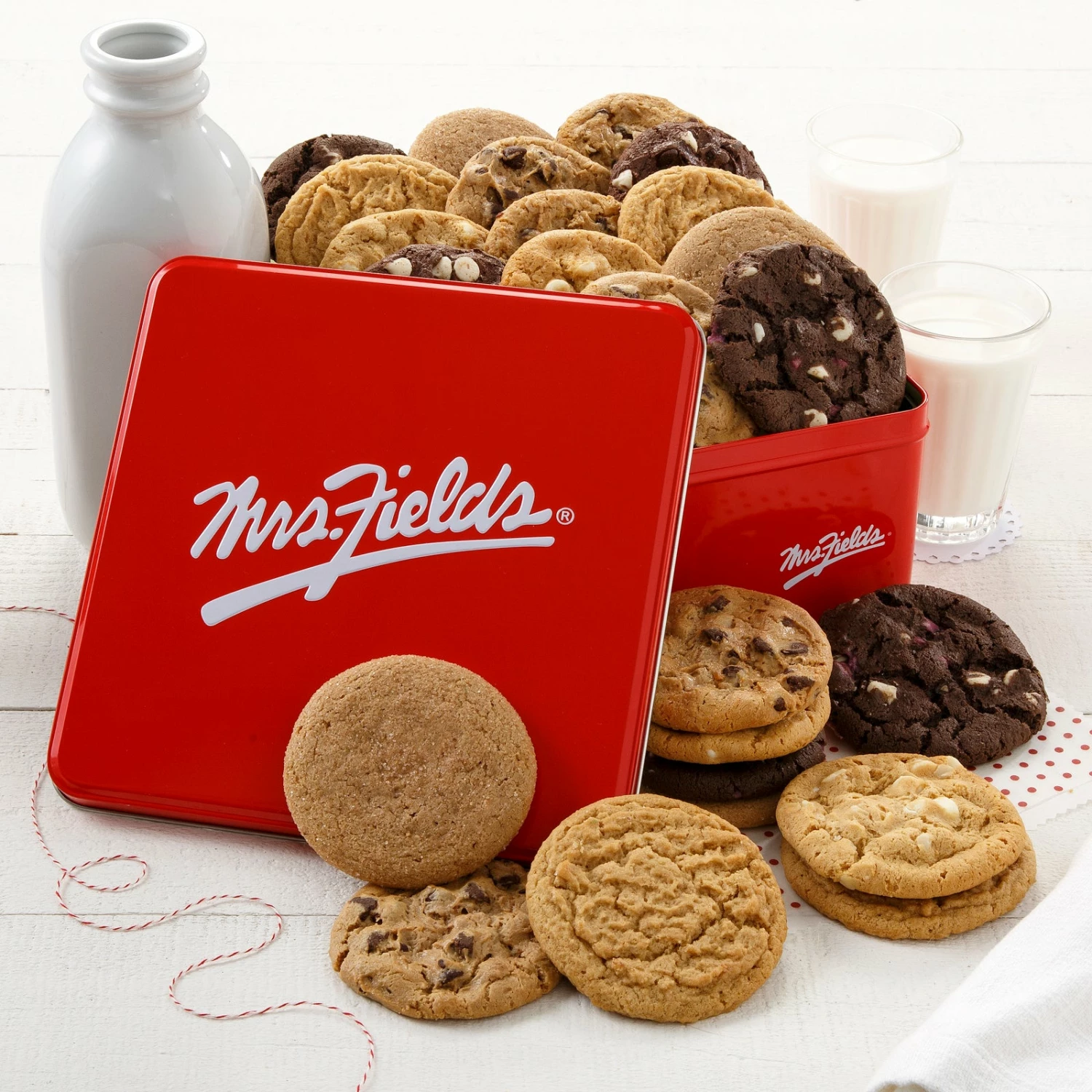 Our world-famous Original Size Cookies are made just as they’ve always been from our original recipe and presented in our signature tin. This Mrs. Fields cookie tin holds a tasty assortment of 24 original cookies in our flavor favorites. Our cookie tins are perfect for any occasion. Get your Mrs. Fields cookie tin today.