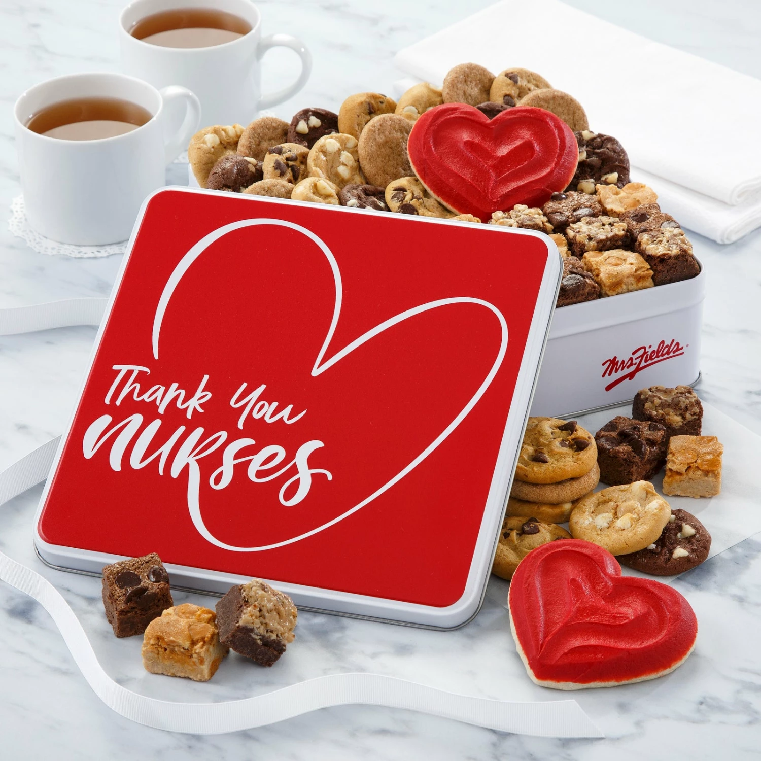 Nurses are a work of heart! Show your thanks with a tin filled with an assortment of 24 Nibblers® Bite-Sized Cookies, 18 brownie bites, and 2 frosted heart-shaped cookies.