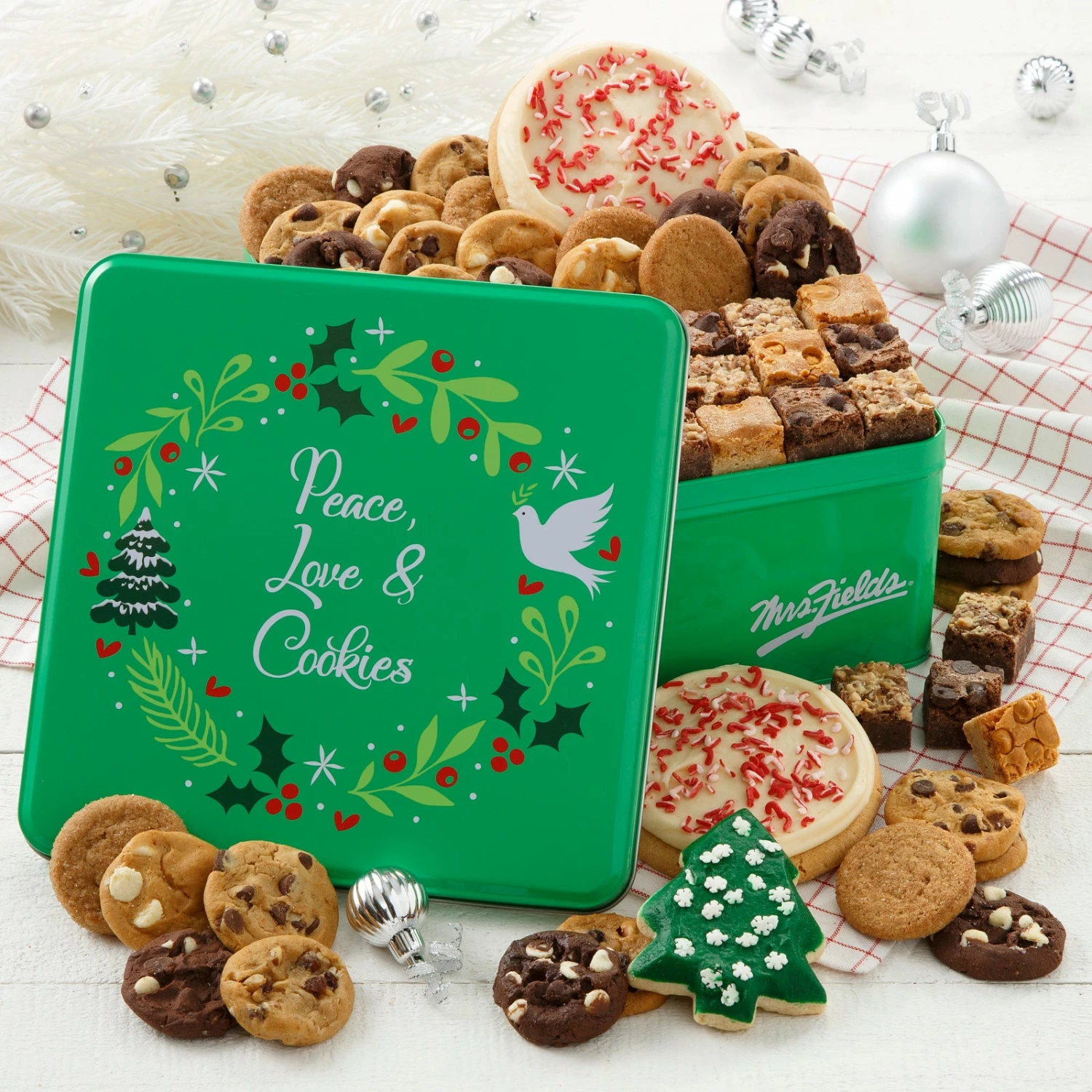 All you need is peace, love, and a collectible tin of Mrs. Field’s best assorted cookies! Our large combo tin comes with 36 Nibblers bite-sized cookies, 18 brownie bites and 2 hand-frosted peppermint cookies, and 1 frosted tree cookie with snowflake sprinkles.