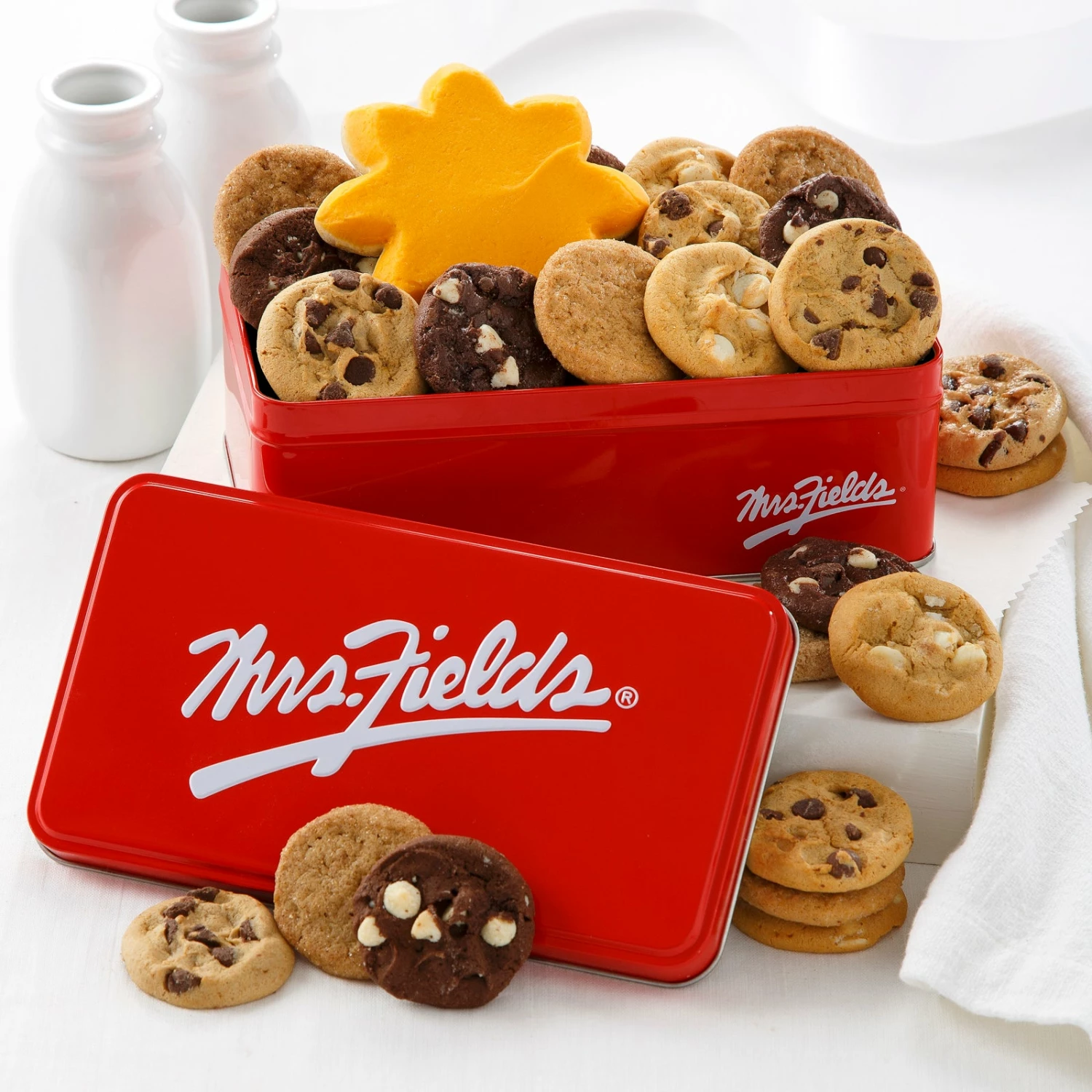 Bring a little sunshine to your day with the classic Mrs.Fields tin. This tin includes 24 Nibblers Bite-Sized Cookies and one frosted sunshine cookie.