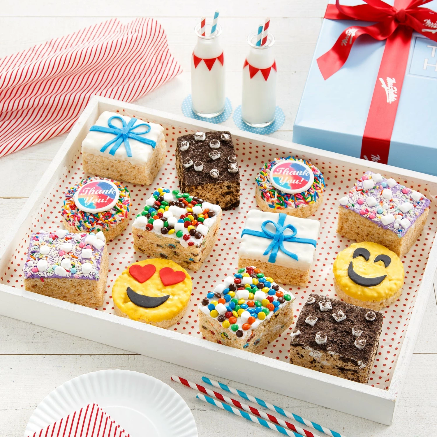 Send the ultimate Thank You gift with this deluxe Treat House box filled with jumbo decorated rice krispie treats that are pull-apart gooey goodness. This collection of treats arrive in a Treat House gift box with Mrs. Fields red gift ribbon. All rice krispie treats are hand-made and uniquely decorated just for you.