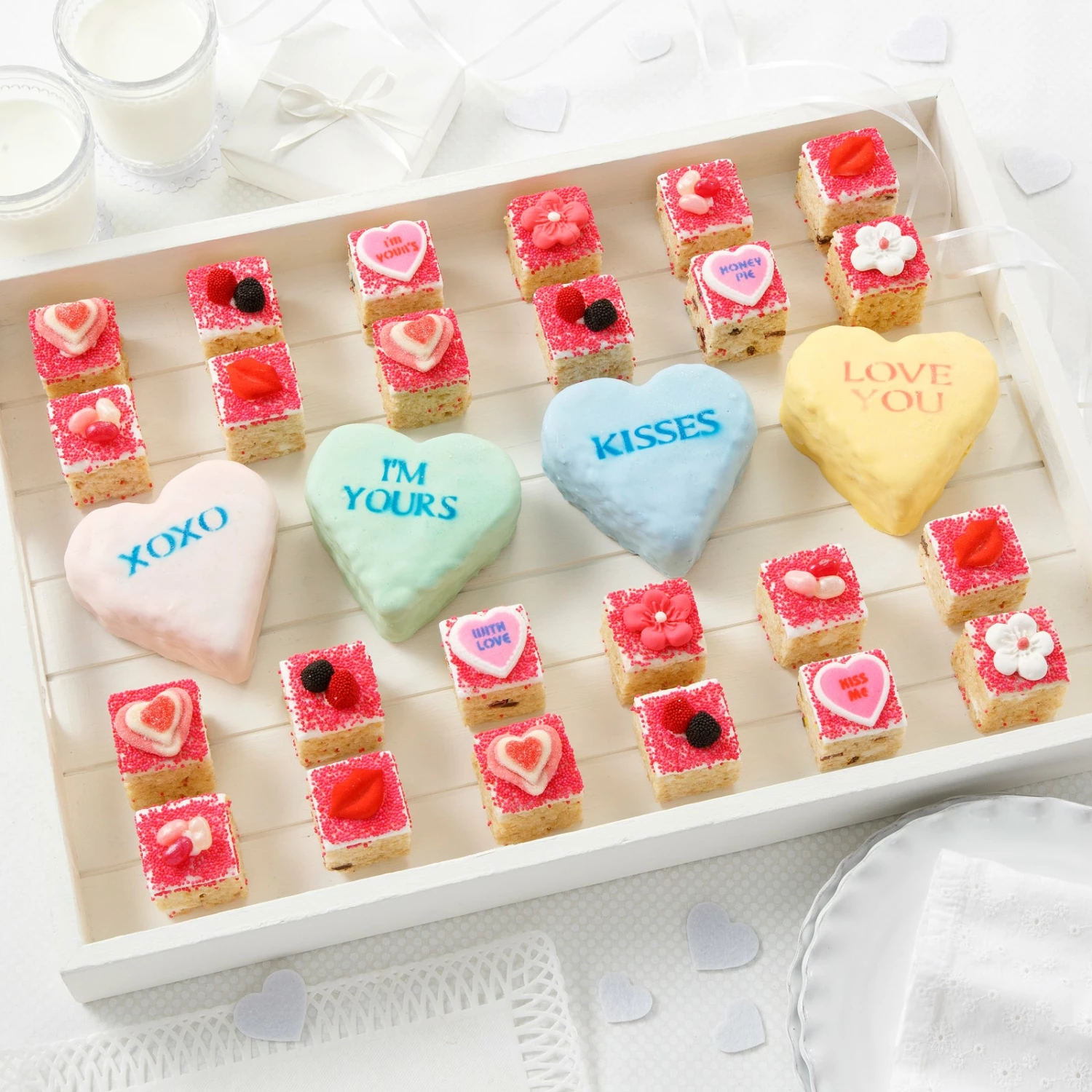 Send your love with this heart filled Valentine’s Day deluxe gift box containing decorated rice krispie treats that are pull-apart gooey goodness. This collection of treats arrive in a Treat House gift box with Mrs. Fields red gift ribbon.