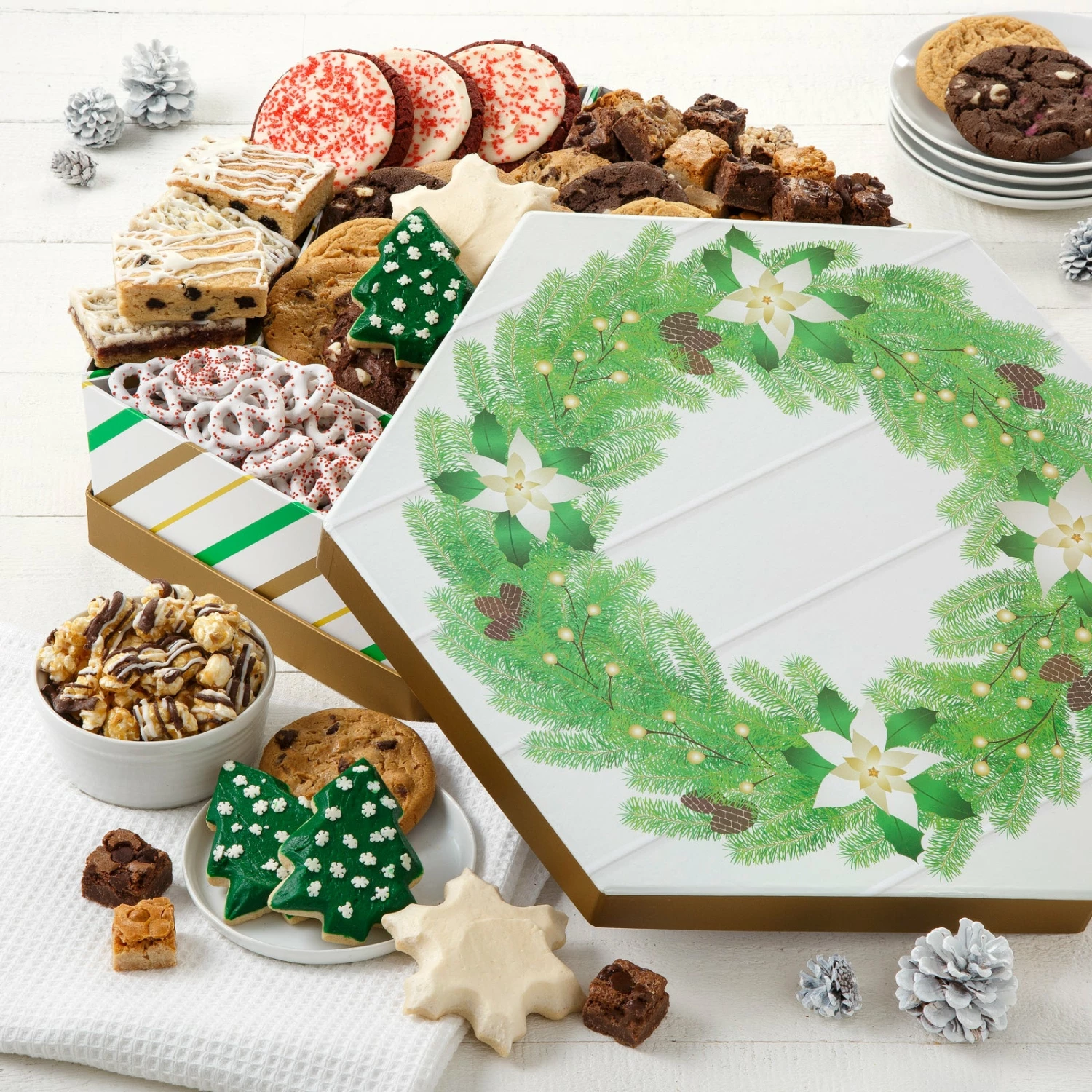 Perfect for your holiday party this giant wreath box has a variety of treats making it the perfect centerpiece for your holiday spread.